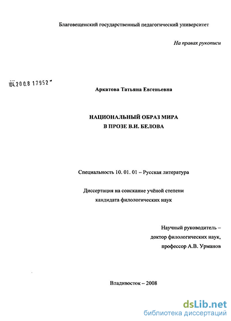Предметом исследования является национальный образ мира, который во многом определяет и формирует своеобразие художественной модели Белова. Национальная картина мира представлена в тесной взаимосвязи с другими элементами художественного бытия – предметным миром, пространством и временем.