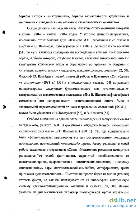 Основа данного направления была заложена отечественными авторами в конце 1980-х - начале 1990-х годов. У истоков данного направления, несомненно, стоит близкий друг Шаламова И.П. Сиротинская: ее статьи и заметки о В. Шаламове, публикующиеся с 1988 г. до настоящего времени [51], по сути являются градационным воссозданием величия писательского образа, «Слово» которого, «глубокое и живое, связанное множеством нитей с культурным контекстом веков и обретающее во времени, в общении с читателем, новые оттенки - смысловые, знаковые, художественные» [52, 60]. Философ Ю. Шрейдер с первой, знаковой работы о Шаламове «Ему удалось не сломаться» (1988 г.) [53] и в последующих статьях [54] по-разному манифестировал следующее фундаментальное для «экзистенциально-катарсического» шаламоведения положение: «Для В. Шаламова философское осмысление его непереносимого экзистенциального опыта было в значительной мере самозащитой от шока запредельных состояний» [55, 83], -в этом были убеждены и И. Золотусский [56], и В. Камянов [57].