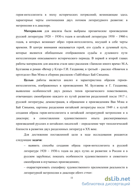 Целью работы является анализ и характеристика образов героев-интеллигентов, изображенных в произведениях М. Булгакова и Г. Газданова; выявление особенностей двух разных типов прозаического повествования, отвечающих своеобразию каждого из путей развития разделенной после 1917 г. русской литературы; демонстрация, в обращении к произведениям Ван Мэна и Бай Сяньюна, картины разделения китайской литературы после 1949 г. и путей создания образа героя-интеллигента в китайской литературной метрополии и в диаспоре; в сопоставлении художественного опыта рассматриваемых