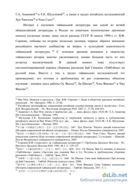 исследование продолжает – в обращении к образу героя-интеллигента в литературе – одну из линий современных историко-литературных исследований, направленных на изучение характера взаимодействия двух путей разделенной после революции 1917 г. русской литературы. Помимо этого, предлагаемая диссертация является первой обстоятельной научной работой, анализирующей (на названном уже материале) черты общего и особенного в судьбах разделенных русской и китайской литератур в XX веке. На примере воплощения в литературных произведениях процесса становления личности героя-интеллигента в переломную эпоху в работе выделены и рассмотрены два типа художественного повествования, отвечающих своеобразию литературной, культурной ситуации здесь и там, на родине и в литературном зарубежье; сопоставлен опыт двух великих национальных литератур, оказавшихся в минувшем столетии в ситуации во многом схожего исторического, духовного разлома.