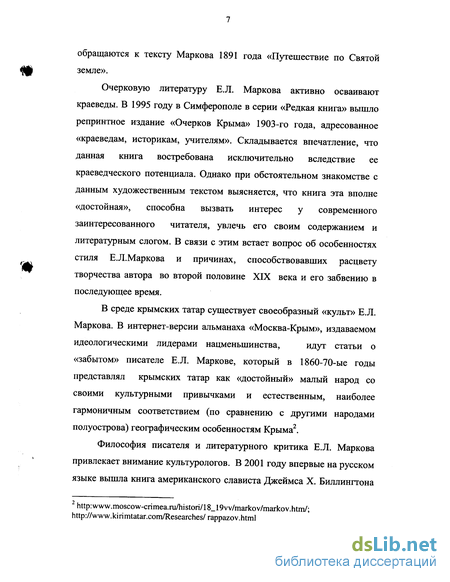 Данное исследование обращено к творчеству одаренного писателя второй половины XIX века Евгения Львовича Маркова (1835-1903). В свое время его книгу «Очерков Крыма» «с великим удовольствием» читал И.С.Тургенев (122, 287), В.В. Розанов называл его «видным писателем, голос которого выслушивался с уважением, а иногда долго помнился» (105, 4). В.Г. Короленко характеризовал как «явление довольно заметное» в литературе, «резкий и звонкий голос в шумной толпе» (48, 18). С.А.Венгеров в своей статье для энциклопедического словаря Брокгуаза и Ефрона отмечал факт широкой известности Е.Л.Маркова во второй половине XIX века (13, 659). А.М.Скабичевский включил анализ художественного творчества автора в содержание своего популярного учебника по истории литературы (115, 320). Он анализировал литературное творчество Маркова в главе, посвященной беллетристам-публицистам либерального лагеря, рассматривал его произведения наряду с широко известными в читательских кругах второй половины XIX века романами П.Д. Боборыкина и В.И. Немировича-Данченко.