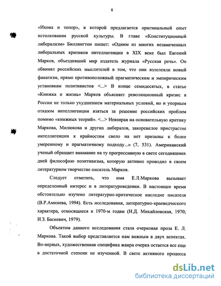 «Икона и топор», в которой предлагается оригинальный опыт истолкования русской культуры. В главе «Конституционный либерализм» Биллингтон пишет: «Одним из многих незамеченных либеральных критиков интеллигенции в XIX веке был Евгений Марков, объездивший мир издатель журнала «Русская речь». Он обвинял российских мыслителей в том, что они взлелеяли новый фанатизм, прямо противоположный прагматическим и эмпирическим установкам позитивистов <...> В конце семидесятых, в статье «Книжка и жизнь» Марков объясняет революционный кризис в России не только ухудшением материальных условий, но и упорным отказом интеллигенции взяться за решение российских проблем помимо «книжных теорий». <...> Невзирая на основательную критику Маркова, Милюкова и других либералов, закоренелое пристрастие интеллигенции к крайностям свело на нет призывы к более умеренному и прагматичному подходу...» (7, 531). Американский ученый обращает внимание на ту прогрессивную в свете сегодняшних дней философию позитивизма, которую активно проводил в своем литературном творчестве писатель Марков.