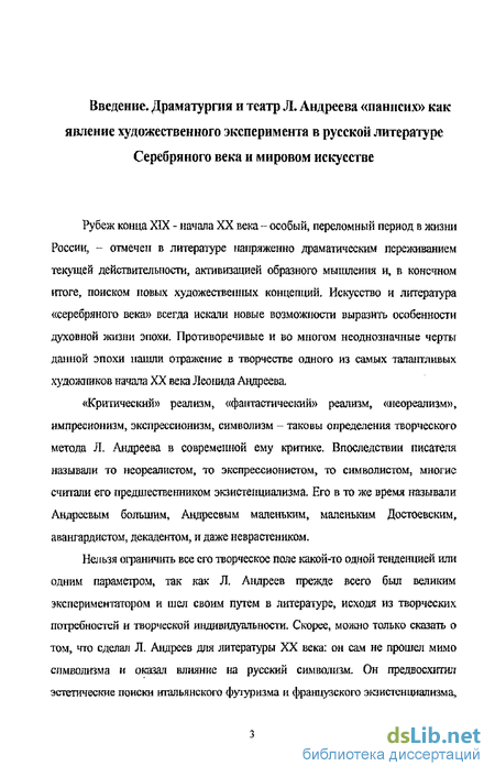 Драматургия и театр Л. Андреева «паннсих» как явление художественного эксперимента в русской литературе Серебряного века и мировом искусстве Рубеж конца XIX - начала XX века - особый, переломный период в жизни России, - отмечен в литературе напряженно драматическим переживанием текущей действительности, активизацией образного мышления и, в конечном итоге, поиском новых художественных концепций. Искусство и литература «серебряного века» всегда искали новые возможности выразить особенности духовной жизни эпохи. Противоречивые и во многом неоднозначные черты данной эпохи нашли отражение в творчестве одного из самых талантливых художгаков начала XX века Леонида Андреева.