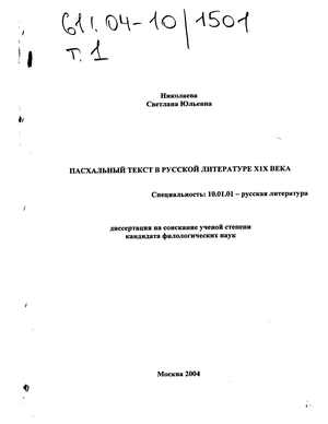 ПРЕДМЕТОМ исследования диссертации стал «пасхальный текст», его происхождение, генезис, динамика бытования в нем мифологических архетипов и вариативное их существование. «Пасхальный текст» - определенный устойчивый текст, который в многочисленных вариациях проявляется в произведениях календарно-духовного пласта русской литературы.
