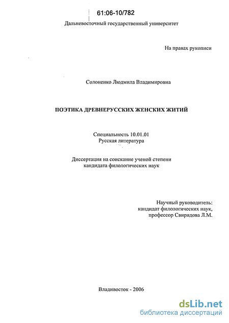 Диссертационное исследование посвящено поэтике древнерусских женских житий.