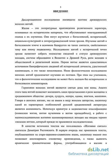 Жития - это литературные произведения религиозного характера, основанные на историческом материале, что обусловливает многоуровневый подход к их изучению. Они могут изучаться с богословской, исторической, социально-культурной и литературоведческой точек зрения. Изучение житий в богословском ключе в основном базируется на типах святости, свойственных тому или иному подвижнику. Исследование житий с исторической точки зрения позволяет собрать множество сведений о статусе древнерусских женщин, системе образования в Византии и Древней Руси, роли женщин в общественной и религиозной жизни. Порою житие является единственным источником биографических сведений об исторической личности, удостоенной канонизации, и это также немаловажно. Наше филологическое исследование женских житий предполагает изучение их поэтики. При этом мы учитывали, что и филологическое исследование не может быть полным без исторических и богословских комментариев.