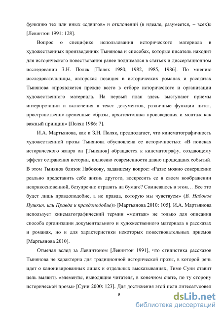 Однако история в текстах Тынянова представляет интерес не только с точки зрения ее корреляции с советской действительностью. По мнениюА.В. Белинкова, любой роман, в том числе и исторический, – способ высказаться о своем времени и отношении к нему: «Исторический роман появляется тогда, когда художник не в состоянии решить что-то для своего времени или ищет истока какого-либо современного явления. Исторический роман не уводит от действительности, а вводит подобие, аналогию и параллель» [Белинков 1965]. Представление описываемых Тыняновым событий только как аналогии советской действительности несколько упрощает тексты, вызвавшие в критике и литературоведении противоречивые оценки. К тому же, если исследуемые тексты – сатира на современность, остается непонятной и скрупулезность работы Тынянова с историческими документами, его игра с цитатами из документальных и художественных источников.