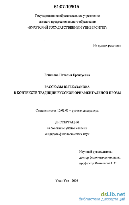 воздействия поэтической формы словесного выражения на прозаический текст Казакова, определить, как орнаментальность обнаруживает определенные качества индивидуального мировосприятия прозаика. В таком преломлении творчество Казакова еще не становилось предметом специального исследования.
