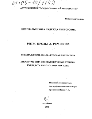 и изложены в семи публикациях (Ритмическая структура книги А. Ремизова «Посолонь» // Анализ литературного произведения в школе и вузе: Материалы Межрегиональной научно-практической конференции. Астрахань, 2003. С. 52-59. (0,8 п.л.); «Симфонизм» как ведущий ритмообразующий приём в книге А. Ремизова «Посолонь» // Ученые записки. Материалы докладов итоговой науч. конф. Астраханского гос. ун-та. Ч. 2: Астрахань, 2003. С. 62-70. (0,6 п.л.); Природа и семантическая функция ритма в поэзии и прозе (о книге Душиной Л. Н. «Русская поэзия и проза XIX-XX вв.: Ритмическая организация текста». Саратов: Изд-во Саратовского ун-та, 2002. 217 с.) // Гуманитарные исследования. Журнал фундаментальных и прикладных исследований. № 8. Астрахань, 2003. С. 152-155. (0,5 п.л.); Глава «О судьбе огненной» в структурно-семантической и ритмической парадигмах романа А. Ремизова «Взвихрённая Русь» // Современная филология в международном пространстве языка и культуры: Труды и материалы Международной научной конференции. Астрахань, 2004. С. 297-299. (0,25 п.л.); Стилистический контраст как основной структурообразующий приём романа А. Ремизова «Взвихрённая Русь» // Россия и Восток. Обучающееся общество и социально-устойчивое развитие Каспийского региона: Материалы III Международной конференции. Астрахань, 2005. Т. II. С. 387-390. (0,5 п.л.) и др.). Диссертация обсуждалась на заседании кафедры русской литературы Астраханского государственного университета и рекомендована к защите.