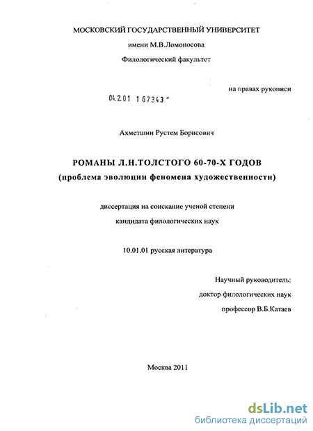 Ахметшин, Рустем Борисович. Романы Л.Н. Толстого 60-70-х годов : проблема эволюции феномена художественности : диссертация ... кандидата филологических наук : 10.01.01 / Ахметшин Рустем Борисович; [Место защиты: Моск. гос. ун-т им. М.В. Ломоносова].- Москва, 2011.- 200 с.: ил. РГБ ОД, 61 12-10/10