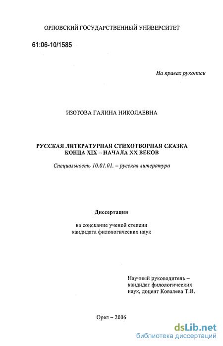 В настоящее время защищено более десятка кандидатских и докторских диссертаций по проблемам литературной сказки. Но при этом стихотворная сказка как жанр целенаправленно не рассматривается ни в одном исследовании. Исключение в этом отношении составляет только специализированное издание «Стихотворная сказка XVIII-начала XIX века» со вступительной статьей А.Н. Соколова, в которой впервые анализируется история создания и этапы эволюции этого жанра[300], и диссертационные исследования O.K. Герлован[126], СВ. Сапожкова[288].