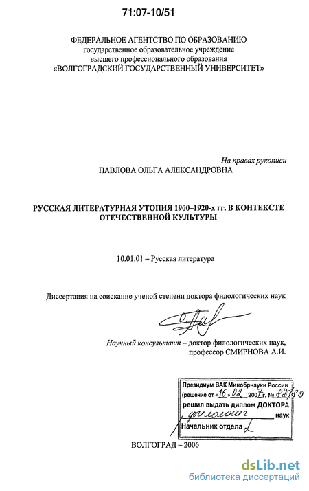 В связи с вышесказанным актуальность темы нашего диссертационного исследования обусловлена особенностями современной ситуации постмодернизма, основа которого заключается в филологической парадигме восприятия мира, в сущности, гомогенной феномену литературной утопии с ее особым типом вымысла, структурированного «обнаженным» приемом игры художественной и действительной реальностями, приводящей к «размытой» условности, отображающей демиургические притязания артистически самоутверждающегося человека. Феномен «человека-артиста», чья поведенческая модель отмечена ценностной амбивалентностью, в России формируется в Серебряный век, «визитной карточкой» панутопизма которого стала театральная утопия. Другой фактор, предопределяющий актуальность нашей работы, связан с попыткой развенчания вышеуказанных стереотипов литературоведческой утопиологии (толкование утопии и антиутопии как различных жанров и жанрообразований научной [социальной] фантастики; осмысление негативной утопии как жанра, содержащего в своей структуре те или иные виды комического, а также как формы, порожденной XX в.).