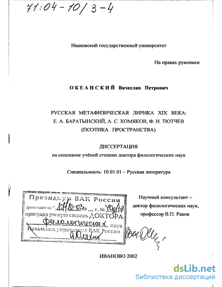 А. С. Хомяков Любая объективная история литературы построена на глубинно поставленной интерпретации — по существу, академически значимой (обоснованной и обосновывающей) теории. После выхода знаменитых работ западно-европейских мыслителей М.Мерло-Понти «Феноменология восприятия» (1945 г.) с особым разделом «Пространство», Г.Башляра «Поэтика пространства» (1957 г.), М.Хайдегтера «Искусство и пространство» (1969 г.) топологическая проблематика ныне активно транспонируется философией, искусствознанием, культурологией, не обошла она и литературоведение, о чем свидетельствует богатое наследие М.М.Бахтина, задолго и совершенно самостоятельно разработавшего глубочайшую прикладную идею «хронотопа», а также труды Ю.М.Лотмана, А.В.Михайлова, В.Н.Топорова... И однако художественная метафизика — метафизическая феноменология поэтического творчества — остается и по сей день предметной сферой, все еще не достаточно раскрытой именно в топологическом отношении. Всеобъемлющее (а именно с этим опытом прежде всего имеет дело метафизика) в слове поэта (и, по-преимуществу, поэта-романтика) становится пространством, со-размерным его душе. Это креативное событие порождает комплекс общезначимых герменевтических