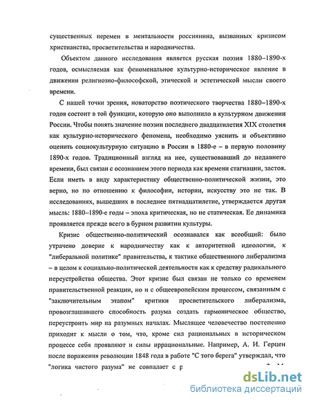 Целью нашего исследования является определение содержательности целого этапа в развитии русской поэзии 1880-1890-х годов, - ее роли и значения в критическую эпоху общего поворота от политики к культуре и роли существенных перемен в ментальности россиянина, вызванных кризисом христианства, просветительства и народничества.