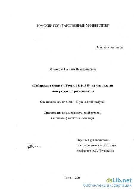Жилякова Наталия Вениаминовна. "Сибирская газета", г. Томск, 1881 - 1888 гг., как явление литературного регионализма : диссертация ... кандидата филологических наук : 10.01.01.- Томск, 2002.- 270 с.: ил. РГБ ОД, 61 03-10/966-8