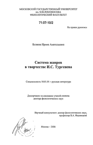 есть закономерность выдвижения на первый план или, наоборот, исчезновения, тех или иных жанров в определенный период творчества писателя. Удалось установить, как развивалось жанровое мышление Тургенева и какие жанры составляли основу его жанровой системы. Изучение системных взаимосвязей между художественными произведениями писателя, обусловленными их разнообразной жанровой природой, позволило глубже понять специфику содержания каждого из них и предложить новые интерпретации известных тургеневских текстов. В аспекте жанровой системности осмыслены замыслы и наброски произведений Тургенева. Этот анализ позволил предположить, что интерес писателя к жанровой парадигме повесть - роман сохранялся и в последние годы творчества.