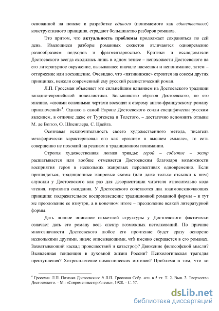 4 Гроссман Л.П. Поэтика Достоевского // Л.П. Гроссман Собр. соч. в 5 тт. Т. 2. Вып. 2. Творчество Достоевского. – М.: «Современные проблемы», 1928. – С. 57.