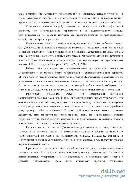 На наш взгляд, в романах Достоевского правомерней выделять не аспекты и не элементы сюжета, а полноценные сюжетные уровни, различные по своей жанровой природе и по идейному содержанию. Дефиниция, описание и систематизация данных уровней производится нами впервые, в чем и состоит главная научная новизна работы. Мы делаем вывод о многоуровневости сюжетных построений в романах Достоевского, каждый из которых «имеет свою, только лишь ему присущую синтагматическую организацию, и это обеспечивает сложность их взаимоотношений»14, согласно наблюдениям Ю.М. Лотмана над романом «Бесы». «Об уровнях модели романа, обладающих высокой степенью упорядоченности (структурностью) и не менее высокой степенью расчлененности