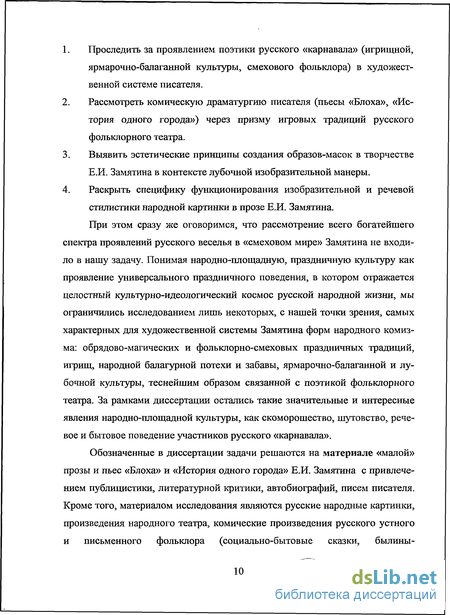 - в детальном рассмотрении проявлений этической и эстетико-поэтической парадигмы лубочной живописи, являющейся основополагающей компонентой «смехового мира» Замятина. Теоретическая значимость исследования состоит в определении места и роли традиций народной праздничной, карнавальной культуры в творчестве Е.И. Замятина и обосновании их доминирующего значения для «смехового мира» прозы писателя; в раскрытии амбивалентного характера смеха в произведениях Е.И. Замятина, родственного фольклорно-мифологическому; в определении специфики художественно-изобразительной манеры писателя в контексте поэтики лубочного искусства. Практическая значимость исследования. Результаты диссертационного исследования могут найти применение в вузовском преподавании истории русской литературы, на уроках литературы и факультативных занятиях в общеобразовательных учреждениях, при изучении курсов «Литературное краеведение» в школах Липецкой области.
