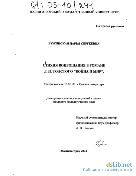 Теоретическую основу диссертационного исследования могут составить труды литературоведов: М. М. Бахтина, неоднократно подчеркивавшего принципиальную значимость вопроса или ответа как организующего начала диалогических отношений любого уровня [см. 20: 441, 445, 446, 460-463, 471-500]; Ю. М. Лотмана, побуждающего нас к "знаковому" прочтению многих вопросительных структур текста [см. 109: 125-127, 430, 467, 482-483, 524, 566, 659]. Историко-литературоведческой базой анализа "Войны и мира" могут явиться труды Н. Н. Арденса, В. Ф. Асмуса, Я. С. Билинкиса, Б. И. Бурсова, П. П. Громова, Э. В. Зайденшнур, Е. Н. Купреяновой, Г. Б. Курляндской, К. Н. Ломунова, Т. Л. Мотылевой, А. А. Сабурова, А. П. Скафтымова, М. Б. Храпченко, Б. М. Эйхенбаума и др.