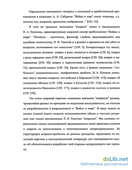 Определенно связывается «вопрос» с тематикой и проблематикой произведения в суждении Л. Л. Сабурова: "Война и мир" имеет тематику, т.е. систему тем, вопросов, предметов изображения..." [141: 32].