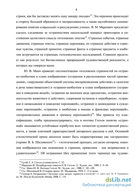 потусторонних сил, – об этом говорят С. А. Гончаров, В. М. Маркович, Ю. В. Манн, К. В. Мочульский. Основной стилистический прием писателя может быть охарактеризован как «остранение» (термин В. Б. Шкловского3) – «эстетический принцип, согласно которому знакомое изображается как незнакомое и странное, привычное – как непривычное и удивительное»4.