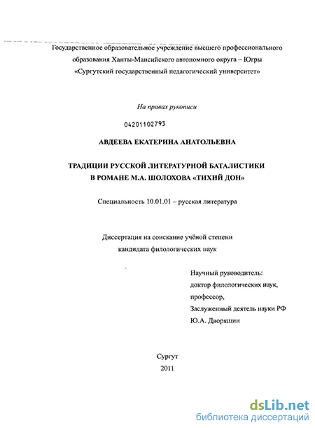 Научная новизна диссертации заключается в том, что в ней: 1) впервые даётся научно обоснованное определение понятия «литературная баталистика»; 2) разработана оригинальная система форм и способов анализа процесса преемственности художественного опыта; 3) осуществлён комплексный анализ романа М.А. Шолохова «Тихий Дон» в аспекте преемственности традиций русской баталистики.