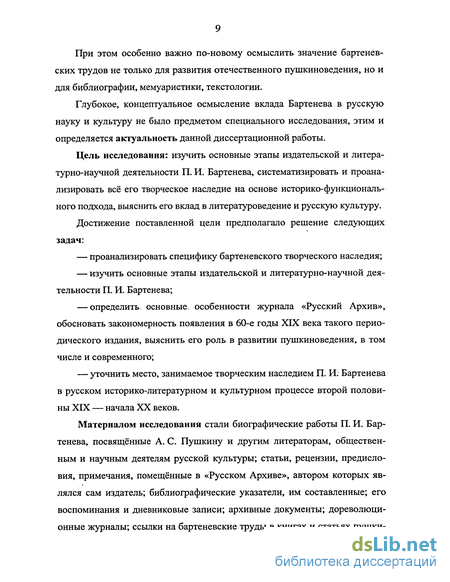 Цель исследования: изучить основные этапы издательской и литературно-научной деятельности П. И. Бартенева, систематизировать и проанализировать всё его творческое наследие на основе историко-функциональ-ного подхода, выяснить его вклад в литературоведение и русскую культуру.