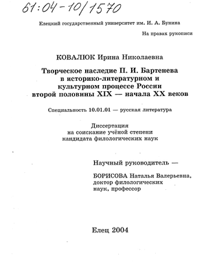 Диссертационное исследование посвящено изучению творческого наследия Петра Ивановича Бартенева (1829 — 1912) — литературоведа (пушкиниста и историка литературы), издателя «Русского Архива», библиографа, архивиста, историка, археографа, переводчика, мемуариста.