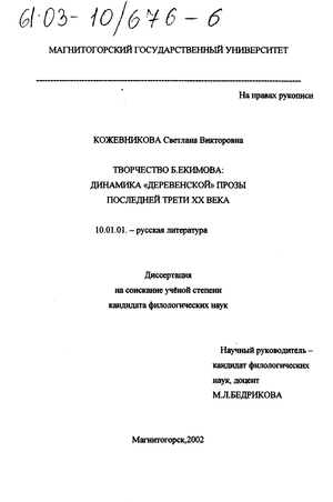 Тема данного исследования «Творчество Б. Екимова: динамика «деревенской» прозы последней трети XX века» вызвана потребностью выявить и осмыслить тенденции развития современной «традиционной» литературы (а именно, такого значительного течения в русской литературе как «деревенская»