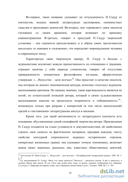 Связь человека с эпохой Н. Садур осмысляет через «вертикаль», когда сходство возникает посредством образного отражения одного в другом, выстраивается по принципу подобия, двойничества. Очевидно, что Н. Садур не «застывает» в определенном периоде, ей чуждо желание выразить мироощущение конкретного поколения, как это происходило, например, в так называемой «прозе сорокалетних», где авторы (ранний В. С. Маканин, А. А. Ким, А. Н. Курчаткин и др.) воспроизводили мироощущение человека эпохи брежневского застоя, который потерял чувство исторического времени и замкнулся в частной жизни39. Ориентация Н. Садур на синхронное совпадение времени создания текста с конкретным историческим периодом придает ее произведениям «динамичность», «изменчивость», ставит замысел в зависимость от внешних, объективных пространственно-временных координат.