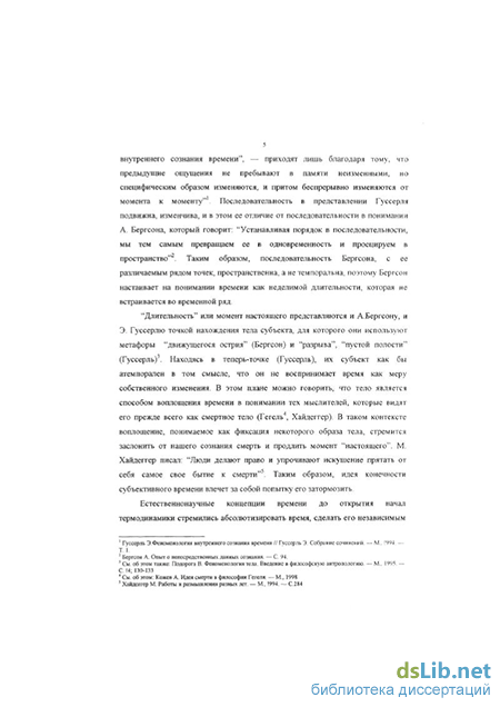 Настоящее, отображаемое часами, не есть настоящее переживаемого времени. Истинное настоящее, по Августину, "тот момент во времени, который невозможно разделить хотя бы на мельчайшие части, но он так стремительно уносится из будущего в прошлое! Длительности в нем нет"3. В отличие от него момент, отмеченный стрелкой часов, может дробиться на бесконечно малые части: час -— на минуты, минута -— на секунды, секунда — на доли секунды. Членимость обусловлена пространственным представлением времени в сознании человека. Цифра не отличается целостностью, которой обладает переживание времени, определяемое как бытие в "Здесь и Теперь". Целостность времени, понимаемого как длительность, отмечает и А. Бергсон Следуя его мысли, можно считать настоящим одно из "состояний сознания, когда оно не устанавливает различия между наличными состояниями и теми, что им предшествовали"1. Часы опосредуют время, проецируя его в пространство и уничтожая то, что Бергсон называет "длительностью". Субъект, доверяющий измерение времени часам, совершает неравноценную замену одного другим, ибо прибор, находящийся вне субъекта и его сознания (души), находится и вне переживаемого времени.