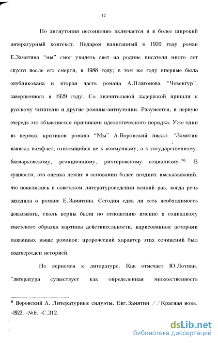 Но антиутопия несомненно включается и в более широкий литературный контекст. Недаром написанный в 1920 году роман Е.Замятина "мы" смог увидеть свет на родине писателя много лет спустя после его смерти, в 1988 году; в том же году впервые была опубликована и вторая часть романа А.Платонова "Чевенгур", завершенного в 1929 году. Со значительной задержкой пришли к русскому читателю и другие романы-антиутопии. Разумеется, в первую очередь это объясняется причинами идеологического порядка. Уже один из первых критиков романа "Мы" А.Воронский писал: "Замятин написал памфлет, относящийся не к коммунизму, а к государственному, бисмарковскому, реакционному, рихтеровскому социализму."6 В сущности, эта оценка лежит в основании более поздних высказываний, что появлялись в советском литературоведении всякий раз, когда речь заходила о романе Е.Замятина. Сегодня едва ли есть необходимость доказывать, сколь верны были по отношению именно к социализму советского образца картины действительности, нарисованные авторами названных выше романов: пророческий характер этих сочинений был подтвержден историей.