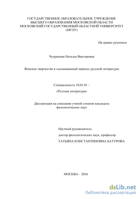 Обращаясь в первой главе к творчеству женщин-писательниц в романтизме, и прежде всего, к интересующему нас «альманашному периоду», отметим наиболее значимые имена авторов. Это такие поэтессы и писательницы, как З.А. Волконская, Н.С. и С.С. Тепловы, М.А. Лисицына, А.И. Готовцева, М.Б. Даргомыжская, Е.А. Тимашева, А.П. Зонтаг, Е.П. Ростопчина. Рассматривая их творчество, исследователи отмечают следование традициям и новаторство.