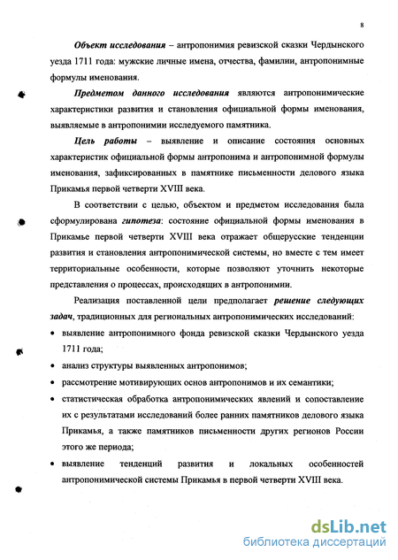 Реализация поставленной цели предполагает решение следующих задач, традиционных для региональных антропонимических исследований: выявление антропонимного фонда ревизской сказки Чердынского уезда 1711 года; анализ структуры выявленных антропонимов; рассмотрение мотивирующих основ антропонимов и их семантики; статистическая обработка антропонимических явлений и сопоставление их с результатами исследований более ранних памятников делового языка Прикамья, а также памятников письменности других регионов России этого же периода; выявление тенденций развития и локальных особенностей антропонимическои системы Прикамья в первой четверти XVIII века.