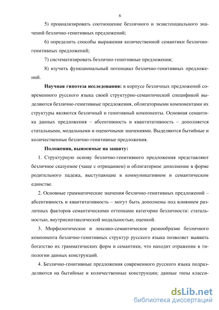Научная гипотеза исследования: в корпусе безличных предложений современного русского языка своей структурно-семантической спецификой выделяются безлично-генитивные предложения, облигаторными компонентами их структуры являются безличный и генитивный компоненты. Основная семантика данных предложения – абсентивность и квантитативность -дополняется статальными, модальными и оценочными значениями. Выделяются бытийные и количественные безлично-генитивные предложения.