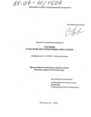 Предмет исследования - образование метатекста с помощью различных языковых средств* в особенности частиц русского языка, выявление условий выполнения/невыполнения метатекстовых функций некоторыми единицами класса частиц.