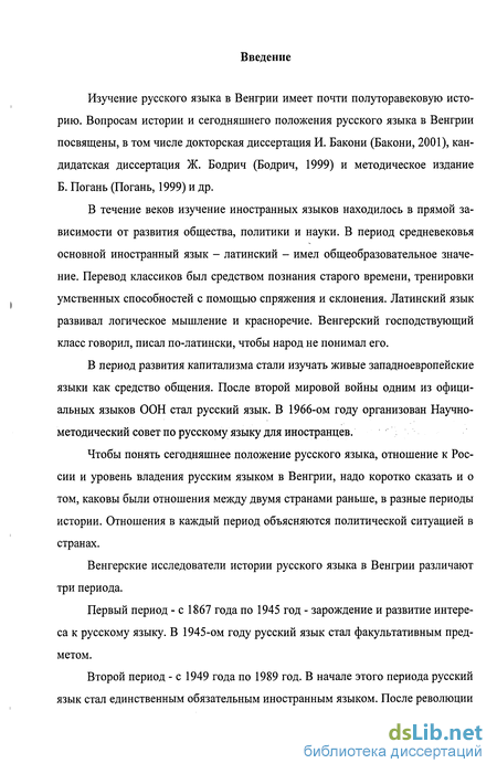 Изучение русского языка в Венгрии имеет почти полуторавековую историю. Вопросам истории и сегодняшнего положения русского языка в Венгрии посвящены, в том числе докторская диссертация И. Бакони (Бакони, 2001), кандидатская диссертация Ж. Бодрич (Бодрич, 1999) и методическое издание Б. Погань (Погань, 1999) и др.