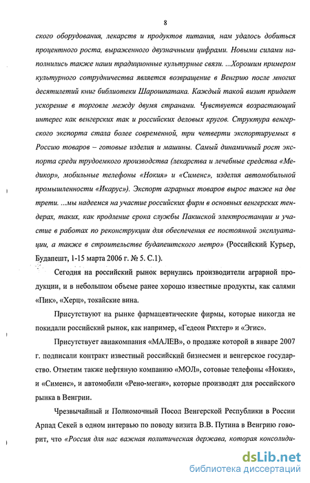 8 ского оборудования, лекарств и продуктов питания, нам удалось добиться процентного роста, выраженного двузначными цифрами. Новыми силами наполнились также наши традиционные культурные связи. ...Хорошим примером культурного сотрудничества является возвращение в Венгрию после многих десятилетий книг библиотеки Шарошпатака. Каждый такой визит придает ускорение в торговле между двумя странами. Чувствуется возрастающий интерес как венгерских так и российских деловых кругов. Структура венгерского экспорта стала более современной, три четверти экспортируемых в Россию товаров - готовые изделия и машины. Самый динамичный рост экспорта среди трудоемкого производства (лекарства и лечебные средства «Ме-дикор», мобильные телефоны «Нокия» и «Сименс», изделия автомобильной промышленности «Икарус»). Экспорт аграрных товаров вырос также на две трети. ...мы надеемся на участие российских фирм в основных венгерских тендерах, таких, как продление срока службы Пакшской электростанции и участие в работах по реконструкции для обеспечения ее постоянной эксплуатации, а также в строительстве будапештского метро» (Российский Курьер, Будапешт, 1-15 марта 2006 г. № 5. С.1).