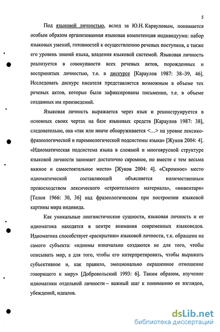 Языковая личность выражается через язык и реконструируется в основных своих чертах на базе языковых средств [Караулов 1987: 38], следовательно, она «так или иначе обнаруживается ... на уровне лексико- фразеологической и паремиологической подсистемы языка» [Жуков 2004: 4]. «Идиоматическая подсистема языка в сложной и многоярусной структуре языковой личности занимает достаточно скромное, но вместе с тем весьма важное и самостоятельное место» [Жуков 2004: 4]. «Скромное» место идиоматической составляющей объясняется количественным превосходством лексического «строительного материала», «инвентаря» [Телия 1966: 30, 36] над фразеологическим при построении языковой картины мира индивида.