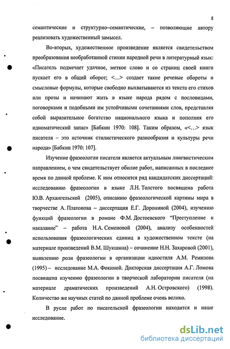 Изучение фразеологии писателя является актуальным лингвистическим направлением, о чем свидетельствует обилие работ, написанных в последнее время по данной проблеме. К ним относится ряд кандидатских диссертаций: исследованию фразеологии в языке Л.Н. Толстого посвящена работа Ю.В. Архангельской (2005), описанию фразеологической картины мира в творчестве А. Платонова - диссертация Е.Г. Дорониной (2004), изучению функций фразеологии в романе Ф.М. Достоевского "Преступление и наказание" - работа Н.А. Семеновой (2004), анализу особенностей использования фразеологических единиц в художественном тексте (на материале произведений В.М. Шукшина) - сочинение Н.Н. Захаровой (2001), выявлению роли фразеологии в организации идиостиля A.M. Ремизова (1995)- исследование М.А. Фокиной. Докторская диссертация А.Г. Ломова посвящена изучению фразеологии в творческой лаборатории писателя (на материале драматических произведений А.Н. Островского) (1998). Количество же научных статей по данной проблеме очень велико.