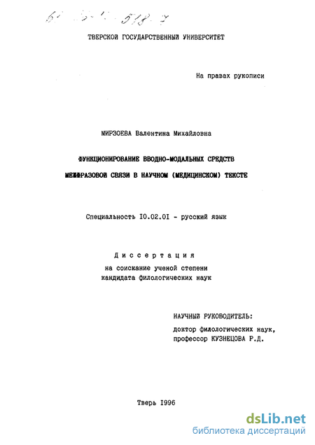 I) определить стилеобразующую специфику вводно-модальных компонентов на лексико-морфологическом и синтаксическом уровнях - 8 -языка на базе медико-биологической подсистемы научного стиля; выявить корпус вводно-модальных средств межфразовой связи, прикрепленный к текстам медицинской специальности; классифицировать их на основе семантического содержания и общности выполняемых функций в формировании связного текста;
