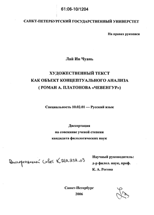 При учёте принципов концептуального анализа художественного текста, разработанных лингвистами Бабенко, Воркачевым , Кубряковой, Романовой и др., мы обращаемся прежде всего к выявлению ведущего концепта текста на основе перехода исследователя как читателя от содержания к смыслу текста (который понимается как «квинтэссенция его содержания», как «проекция плана содержания языкового выражения на сознание интерпретатора с присущими ему представлениями о мире и сие-темой ценностей» - Кобозева, 2000, 328). Последующий лингвистический анализ должен подтвердить или опровергнуть полученное представление. С этих позиций мы обратились к одному из крупнейших произведений XX века, роману «Чевенгур» А. Платонова, несущему на себе печать авторского своеобразия, как объекту исследования. Несмотря на то, что