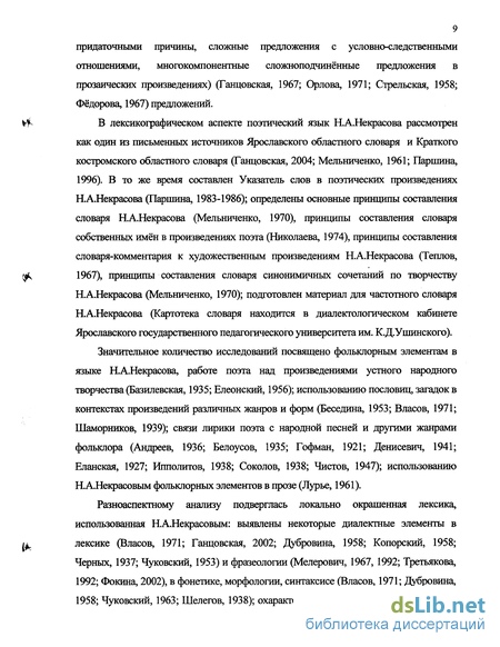 Исследования, посвященные языку произведений Н.А.Некрасова, охватывают широкий спектр вопросов, связанных с анализом различных сторон творческого наследия поэта. К настоящему времени изучены общие особенности язьпса Н.А.Некрасова (Виноградов, 1959; Власов, 1966,1971; Голованенко, 1930; Голубков, 1939; Денисевич, 1941; Дурново, 1966; Корман, 1956; Ларин, 1952; Мельниченко, 1970; Чуковский, 1962 и др.) и язьпса отдельных произведений поэта (Власов, 1955, 1966; Ганцовская, 2002; Кудряшов, 1929; Мельниченко, 1970; Никифоров, 1946; Озерова, 1953; Паршина, 1992; Плахотшина, 1949; Червяковский, 1967; Яковлев, 1952 и др.); художественное мастерство, новаторство, эстетические взгляды Некрасова (Дубровина, 1958; Евгеньев-Максимов, 1928; Исаковский, 1949; Колесницкая, 1956; Литвинов, 1935; Степанов, 1938; Чуковский, 1962; Шувалов, 1922 и др.); охарактеризованы черты стиля поэта (Власов, 1966; Дубровина, 1970; Колесницкая, 1956; Марджанишвили, 1958; Маршак, 1950; Нейман, 1955; Прокшин, 1962; Смирнов-Кутачевский, 1938; Чуковский, 1949 и др.).