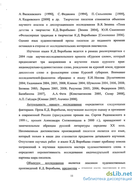 А.Василевского [1990], С. Федякина [1994], П.Сальникова [1999], А. Кедровского [2000] и др. Творчество писателя становится объектом научного анализа в диссертационном исследовании В.Я. Зимина «Тема детства в творчестве К.Д. Воробьева» [Зимин 2004], Ю.И. Симоненко «Фольклорные традиции в творчестве К.Д. Воробьева» [Симоненко 2006]. Однако язык художественной прозы писателя до недавнего времени оставался в стороне от исследовательских интересов лингвистов.