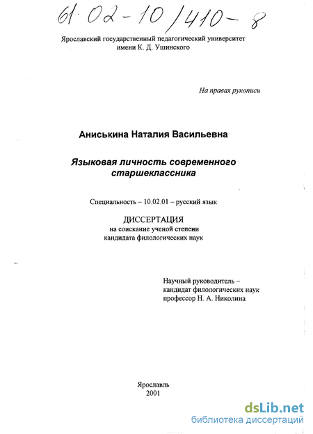Итак, исследование особенностей коллективной ЯЛ современного старшеклассника возможно постольку, поскольку этой группе носителей языка присущи общие психологические закономерности, обусловленные возрастными особенностями и общим видом основной деятельности (учеба в школе). В то же время нами исследуются и индивидуальные особенности развития ЯЛ, что нашло свое отражение в главе 5 и в приложении, где даны описания языковых личностей двух старшеклассников.