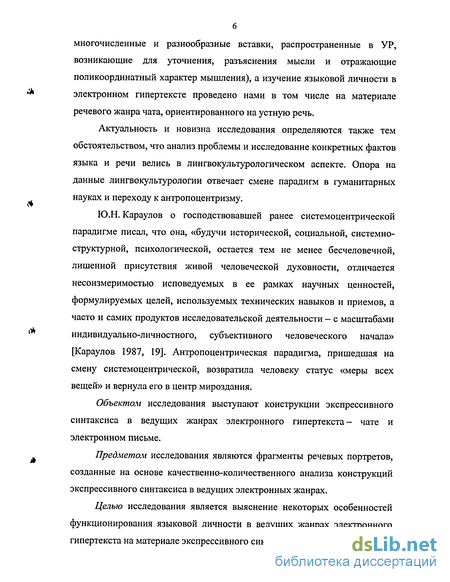 Развитие антропоцентрического направления в лингвистике усилило & и вывело на качественно иную ступень давно существовавший в науке о языке интерес к человеку, к языковой личности, которая изучается в настоящее время на самом разнообразном материале. Однако языковая личность в электронном гипертексте пока не была предметом специального лингвистического исследования, хотя возрастающая в нашем обществе роль электронного общения делает такое исследование весьма актуальным.