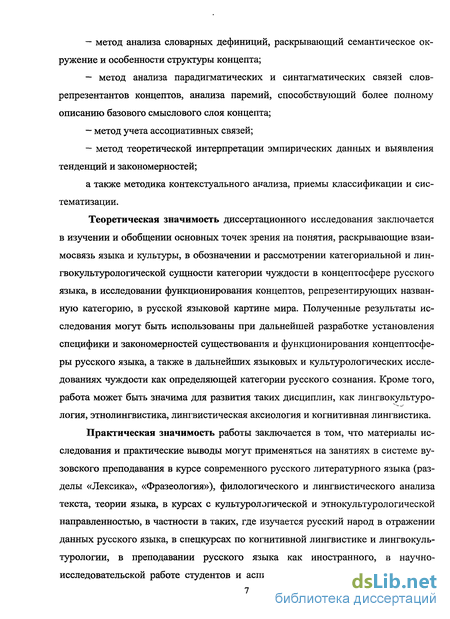 Теоретическая значимость диссертационного исследования заключается в изучении и обобщении основных точек зрения на понятия, раскрывающие взаимосвязь языка и культуры, в обозначении и рассмотрении категориальной и лин-гвокультурологической сущности категории чуждости в концептосфере русского языка, в исследовании функционирования концептов, репрезентирующих названную категорию, в русской языковой картине мира. Полученные результаты исследования могут быть использованы при дальнейшей разработке установления специфики и закономерностей существования и функционирования концептосфе-ры русского языка, а также в дальнейших языковых и культурологических исследованиях чуждости как определяющей категории русского сознания. Кроме того, работа может быть значима для развития таких дисциплин, как лингвокультуро-логия, этнолингвистика, лингвистическая аксиология и когнитивная лингвистика.