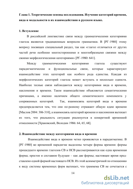 Особенно тесные связи – как парадигматические, так и функциональные – существуют между категориями вида и времени, которые рассматриваются в работах многих российских лингвистов: В. В. Виноградова, Ю. П. Князева, Е. В. Падучевой, Е. В. Петрухиной, В. С. Храковского, А. Л. Шарандина, и др. Но и в вопросе взаимодействия глагольных категорий вида и времени остаются аспекты, требующие дополнительного изучения с привлечением новых методов корпусной лингвистики и количественного анализа. Эти методы позволяют определить