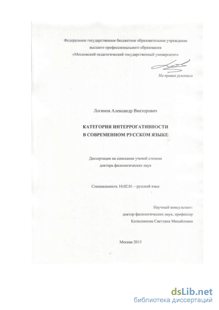 интеррогативности с учетом функционально-семантического, структурно-семантического, коммуникативного и прагматического подходов к изучению языковых единиц и представлена целостная концепция исследуемой категории; впервые доказано, что категория интеррогативности является функционально-семантической категорией, совмещающей признаки двух полевых организаций: модальности и коммуникативной перспективы высказывания, и в основе которой лежит монокатегориальное гетерогенное функционально-семантическое поле смешанного типа; выделена и обоснована специфика интеррогативного значения путем сопоставления с семантикой неизвестности и неопределенности; расширено языковое значение интеррогативности с учетом взаимодействия поля интеррогативности с другими полями: бытийности, побудительности, экспрессивности, эмоциональности, а также уточнены условия их проявления, связанные с нейтрализацией категориального значения интеррогативности в конкретных коммуникативно-прагматических ситуациях; с учетом функционально-семантических и прагматических факторов комплексно описаны ядерные и периферийные лексические и синтаксические средства организации функционально-семантической категории интеррогативности, при этом установлено, что в качестве грамматикализованного ядра интеррогативности выступает система разноуровневых средств: синтаксическая категория интеррогативности (вопросительные предложения), лексико-грамматическая категория (вопросительные местоимения, частицы, глаголы с семантикой запроса); уточнены и расширены особенности реализации интеррогативной ситуации во внутренней речи коммуникантов, установлены отличия от ее